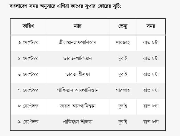 ঢাকা: গ্রুপ পর্ব শেষে শুরু হচ্ছে এশিয়া কাপের সুপার ফোর। টিকে থাকা দলগুলো নিজেদের মধ্যে লড়বে আসরের ফাইনালের টিকিট নিশ্চিতের জন্য।