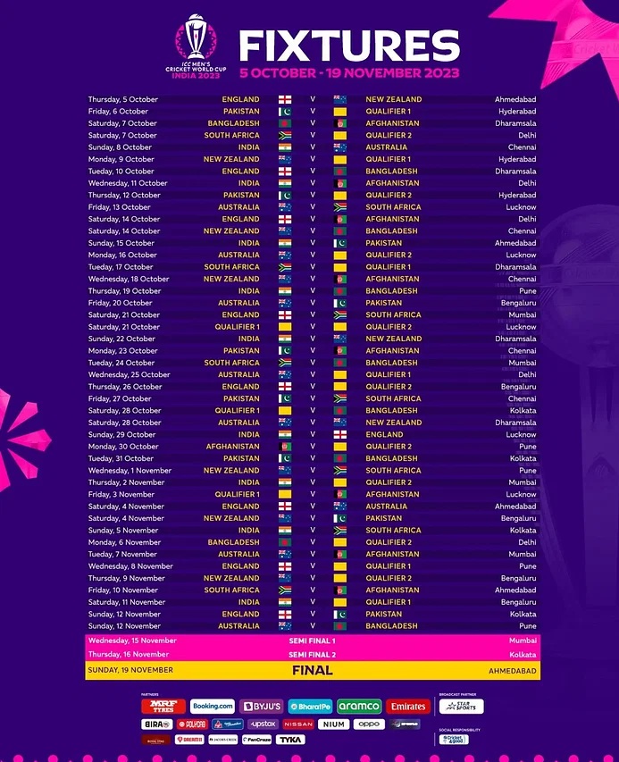 বিশ্বকাপের পর্দা উঠবে আগামী ৫ অক্টোবর। উদ্বোধনী ম্যাচে মুখোমুখি হবে গতবারের চ্যাম্পিয়ন ইংল্যান্ড ও রানার্সআপ নিউজিল্যান্ড। স্বাগতিক ভারত ৮ অক্টোবর চেন্নাইয়ে প্রথম ম্যাচ খেলবে পাঁচবারের চ্যাম্পিয়ন অস্ট্রেলিয়ার বিপক্ষে। ১৫ অক্টোবর আহমেদাবাদে হচ্ছে ভারত-পাকিস্তানের লড়াই।