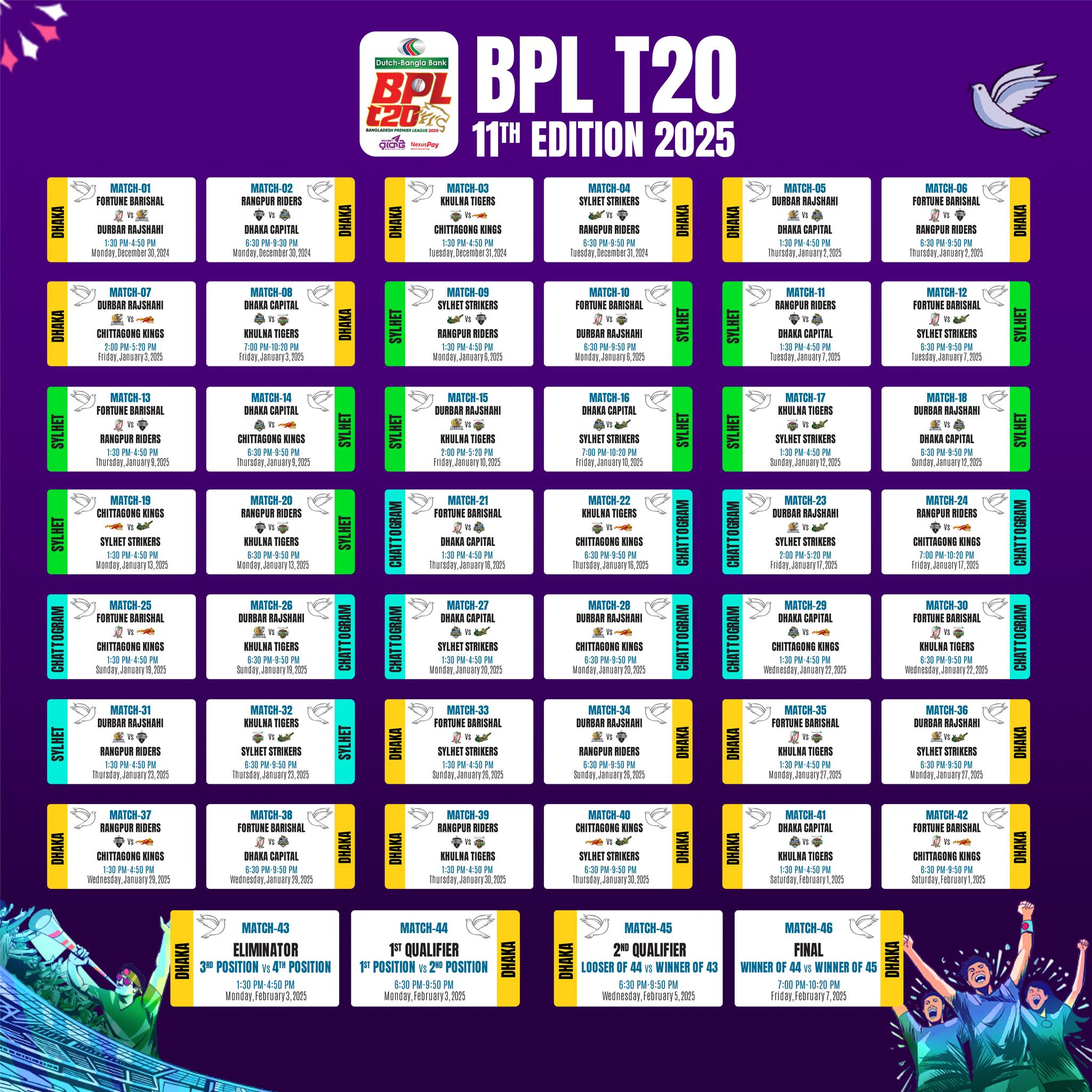 বিপিএল ২০২৫ এ দিনের ম্যাচগুলো হবে ১:৩০ টা থেকে ৪:৫০ পর্যন্ত। তবে শুক্রবারের দিনের ম্যাচ গুলো হবে দুপুর দুইটায় ও সন্ধ্যা সাতটায়! এছাড়া রাতের ম্যাচগুলো শুরু হবে সন্ধ্যা ৬:৩০ টা থেকে ৯:৫০ পর্যন্ত।