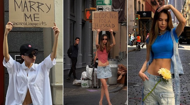 ইনস্টাগ্রামে ভাইরাল ভিডিওতে দেখা যায়, রাস্তায় ‘স্বামী খুঁজছি’ প্ল্যাকার্ড নিয়ে দাঁড়িয়ে রয়েছেন ক্যারোলিনা। আর তা নজরেও পড়ছে অনেকের।