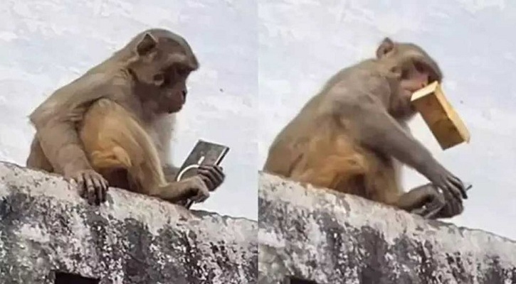 সোশ্যাল মিডিয়া প্ল্যাটফর্ম ইনস্টাগ্রামের পোস্ট করা একটি ভিডিওতে দেখা যায়, বাড়ির কার্নিশে বসে রয়েছে একটি বানর। তার হাতে দামি ফোন। বাড়ির নিচে দাঁড়িয়ে আছেন তিন জন। জুসের একটি প্যাকেট বানরের দিকে ছুড়ে দেওয়ার চেষ্টা করছেন তাঁরা। প্রথম চেষ্টায় ব্যর্থ হলেও দ্বিতীয় চেষ্টায় বানরটি জুসের প্যাকেটটি ধরে ফেলে। এরপর প্যাকেটটি মুখে চেপে ধরে ফোনটি রাস্তায় ছুড়ে ফেলে দেয়।