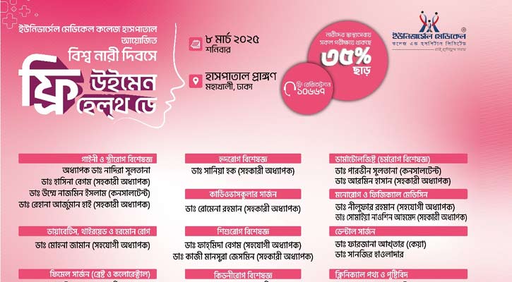 ঢাকা: প্রতিবছরের ন্যায় এবারও শনিবার (৮ই মার্চ) 'বিশ্ব নারী দিবস' উপলক্ষে রাজধানীর মহাখালীস্থ ইউনিভার্সেল মেডিকেল কলেজ হাসপাতাল নারীদের স্বাস্থ্যসেবা ও সচেতনতার কথা বিবেচনা করে আয়োজন করেছে “ফ্রি উইমেন হেল্থ ডে”।
